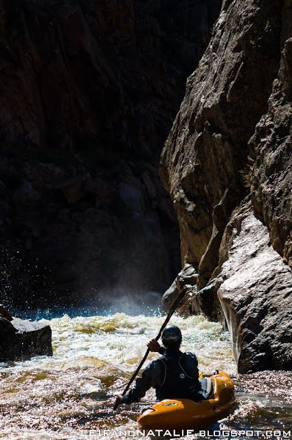 I really like this photo, and there's a funny story behind it. Apparently while we were getting ready, Spencer kept warning Josh about an eddy at the bottom of this drop. Spencer has swam out of this eddy a few times, and he was describing to Josh how to avoid getting stuck in there. Josh kind of brushed it off, with a reply like "Spencer, I'm a kayak instructor. I know how to eddy turn." We even chuckled about it in the eddy above the drop while we waited for Spencer to get ready at the bottom. As you can probably guess, Josh got a little off line, lost his angle, and washed into the eddy of doom upsidedown. He ended up taking his first swim in about 7 years out of the very eddy he had been warned about. We all had a great laugh about it later.